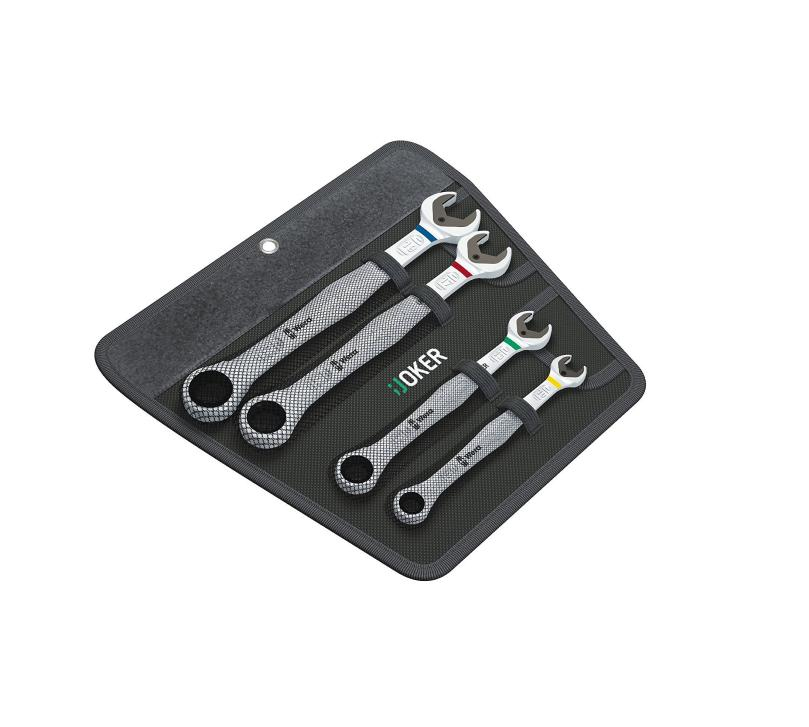 Ratcheting combination wrench; unique holding function, thanks to the metal plate in the jaw, reduces the risk of dropping nuts and bolts; replaceable metal plate in the jaw secures nuts and bolts with its extra hard teeth and reduces the danger of slipping; integrated limit stop prevents any slipping around the bolt head and allows higher torque to be applied; double-hex geometry makes for a positive connection with nuts or bolts and reduces the risk of slipping; return angle of only 30° at the open end to avoid time consuming flipping of the wrench during fastening jobs; ratchet mechanism at the ring end, with an exceptional, fine-tooth mechanism – 80 teeth in all – enables flexibility in very confined working spaces; specially forged geometry for high torque transfer and strength; high performance chrome molybdenum steel; nickel-chrome coating for high corrosion protection. Colour coding and forged dimension details to enable the desired JOKER to be easily located.