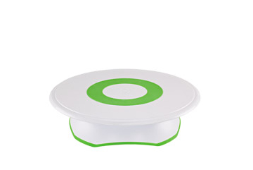 Great for both left-handed and right-handed decorators, the rotating cake stand turns smoothly clockwise and counterclockwise on a hidden ball-bearing track and also easily locks in place when desired for steady lettering and delicate flowers. The non-slip design of the 12-inch platform has a soft-grip ring molded into it to keep your cake in place. The Trim 'n Turn Ultra Cake Turntable makes cake decorating easier in every step of the process, from leveling and torting the cake layers and icing the layered cake to combing the sides of your cake and creating detailed borders along the base and top edges and icing work along the sides. The 3-inch raised base also has a non-slip edge to keep the turntable from moving on your work surface. The rotating cake stand can hold a cake up to 11 inches diameter with the platform still visible and can even accommodate a larger cake on a cake board. Trim 'n Turn Ultra Cake Turntable can even be used for serving or display.