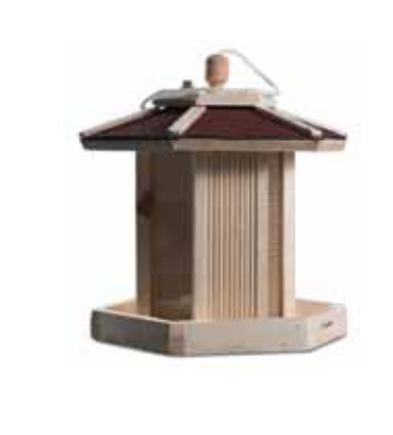 The solid bird house is manufactured from spruce wood, and the roof covered with red bitumen shingles. The bird food is fed in through the easy-to-open roof. The food level is clearly visible through the glass window. A cord for hanging is supplied.