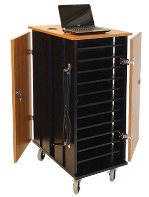 The space mobile Netbook cabinet design saves valuable floor space in your classroom, business office, computer lab and library. Both the attractive Gray Granite with Black and Cherry with Black finishes compliment your décor. Visible power connections allow you to see exactly where each NetBook is being powered in and charged. Our attractive NetBook mobile carts look professional and are designed for convenience and durability.