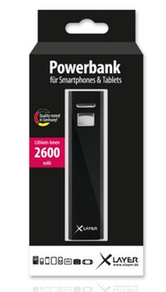 XLayer 2600. Colour of product: Black, Housing material: Aluminium, Charger compatibility: Smartphone, Tablet. Battery technology: Lithium Polymer (LiPo), Battery capacity: 2600 mAh, Charging source: AC, USB. Width: 21.1 mm, Depth: 22.2 mm, Height: 94.8 mm. Cables included: Micro-USB, USB